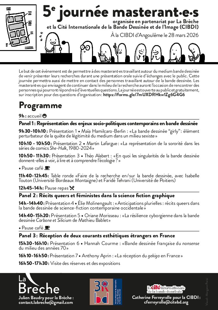 La Brèche, association de recherche en bande dessinée, organise le samedi 28 mars 2026 sa cinquième journée des masterant·es en partenariat avec la CIBDI. Le but de cet évènement est de permettre à des masterant·es travaillant autour du medium bande dessinée de venir présenter leurs recherches durant une présentation orale suivie d’échanges avec le public. Cette journée permettra aussi de mettre en contact des personnes travaillant autour de la bande dessinée. Les masterant·es qui envisagent de continuer dans le milieu de la recherche auront l’occasion de rencontrer des personnes qui pourront répondre à d’éventuelles questions. Le programme Télécharger le programme de la journée des masterant·e·s en pdf (pdf, 1.10 Mo) La journée à lieu de 9h à 17h30 à Angoulême au musée de la bande dessinée. 9h : accueil :D Panel 1 : Représentation des enjeux socio-politiques contemporains en bande dessinée 9 h 30 - 10 h 10 : [...]